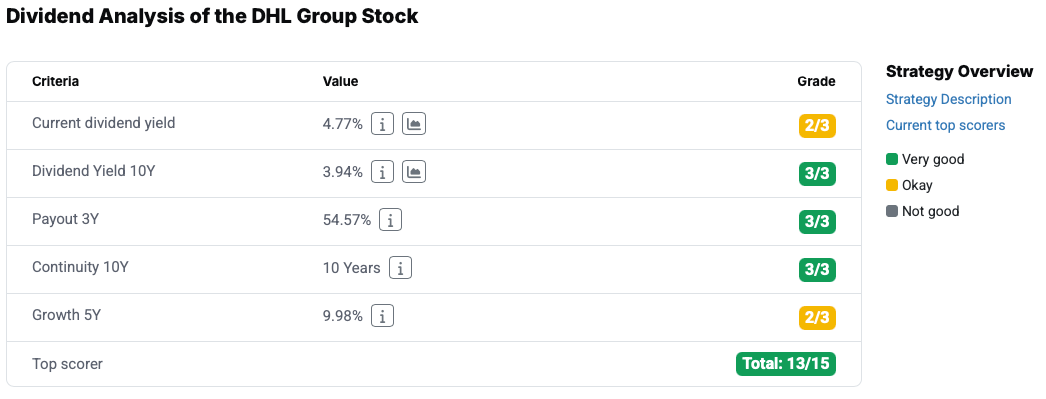 In terms of dividend payments, DHL Group has been one of the most reliable dividend payers in the DAX 40 for years – and this is also reflected in its current dividend score of 13 out of 15 points.