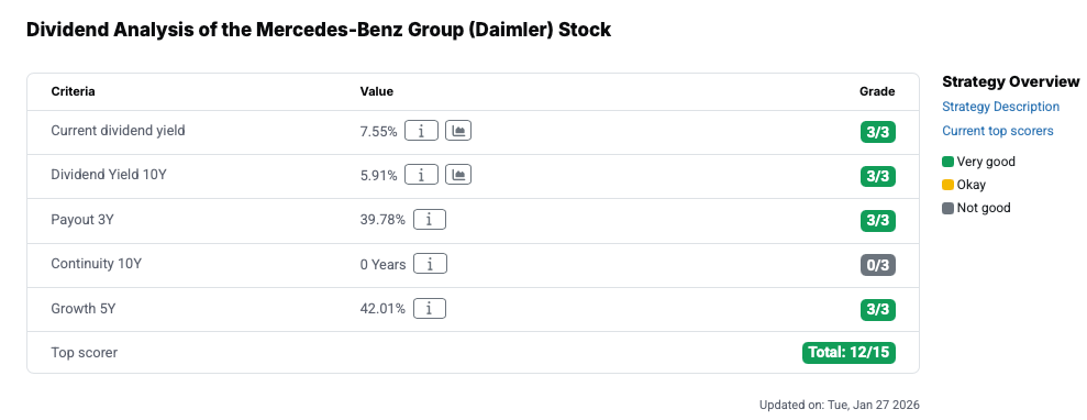 With a price-earnings ratio of 9, for example, the company is well below the long-term market average and below many international car manufacturers. The EV/free cash flow ratio of 11 also signals a moderate valuation. At 7.3 percent, the dividend yield is also very attractive and is one of the stock's greatest strengths. This makes Mercedes-Benz shares particularly interesting for income-oriented investors. At the same time, however, it is also clear that the market is skeptical about the high payout. Exceptionally high dividend yields are often due to limited growth expectations or increased risks. This is also the case with Mercedes-Benz. In the past, dividend cuts have been a frequent occurrence. Nevertheless, the stock performs extremely well in the dividend analysis, scoring 12 out of a possible 15 points.