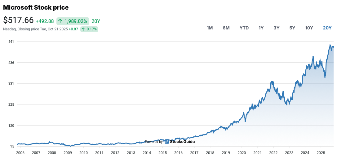 Microsoft stock (ISIN: US5949181045) remains one of the most successful stocks in the technology sector today. Over the past ten years, it has delivered impressive gains of around 1,000 percent to investors, thanks primarily to its continued success in the cloud and AI business. However, after the last major consolidation in 2022 and early 2025, the stock price repeatedly reached new all-time highs. The stock is currently trading at around $514, which corresponds to a market capitalization of over $3.8 trillion.