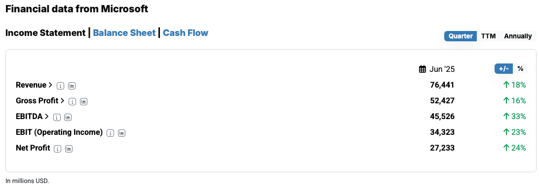 Microsoft once again achieved very strong results in the most recent quarter and grew in almost all areas. Specifically, revenue in the fourth quarter of 2025 (quarter end: June 30, 2025) increased by 18 percent to US$76.4 billion. EBITDA increased by a third, while net profit also rose disproportionately by 24 percent to $27.2 billion.