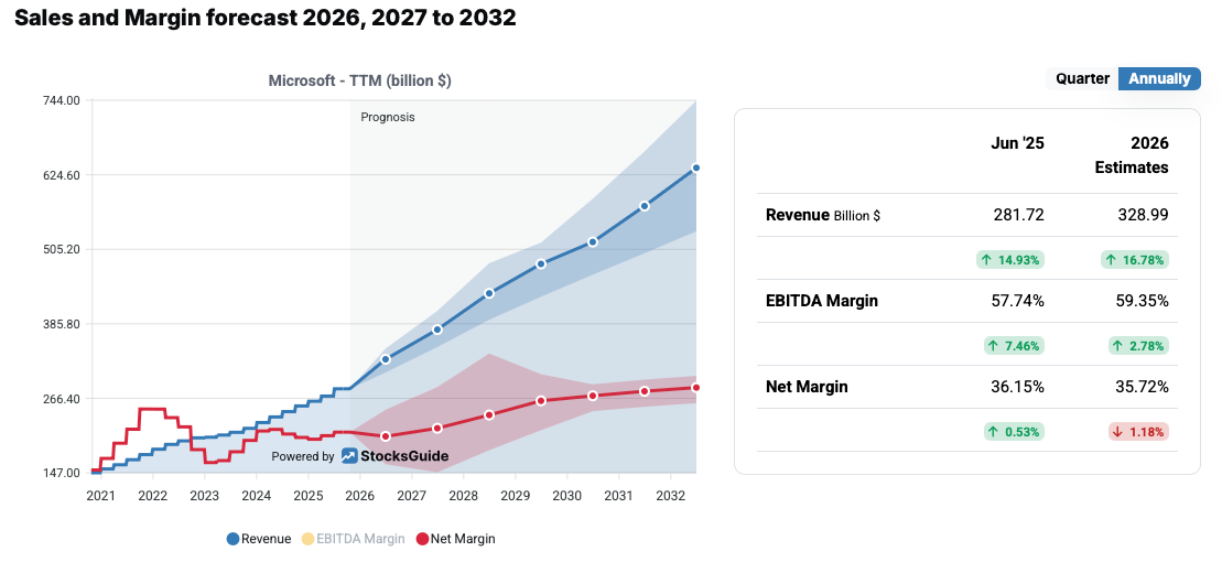 Analysts' revenue forecasts for Microsoft show continued strong but increasingly differentiated growth in the coming years. After a sharp rise in 2026 and 2027, driven primarily by continued growth in the cloud and AI business, analysts expect momentum to level off somewhat from 2029 onwards. A phase of more mature growth could set in. By 2032, however, revenue is expected to rise to around $607 billion, more than doubling compared to 2025. The strongest growth is still expected to come from cloud services (Azure, Microsoft 365, Dynamics) and artificial intelligence. These segments are likely to make the largest contribution as companies and public institutions continue to modernize their digital infrastructures and increasingly integrate AI solutions into everyday life. The slight slowdown in growth around 2029/2030, on the other hand, could indicate market saturation in some sub-sectors, such as traditional software subscriptions or the hardware business. However, the subsequent recovery in growth rates until 2032 indicates that new innovation cycles – for example, through generative AI, new cloud models, or the expansion of global data centers – will provide fresh impetus. In the long term, Microsoft is thus positioning itself as a broadly diversified technology provider that is increasingly basing its revenue growth on recurring, high-margin cloud and AI services and has solid prospects for average double-digit growth rates.
