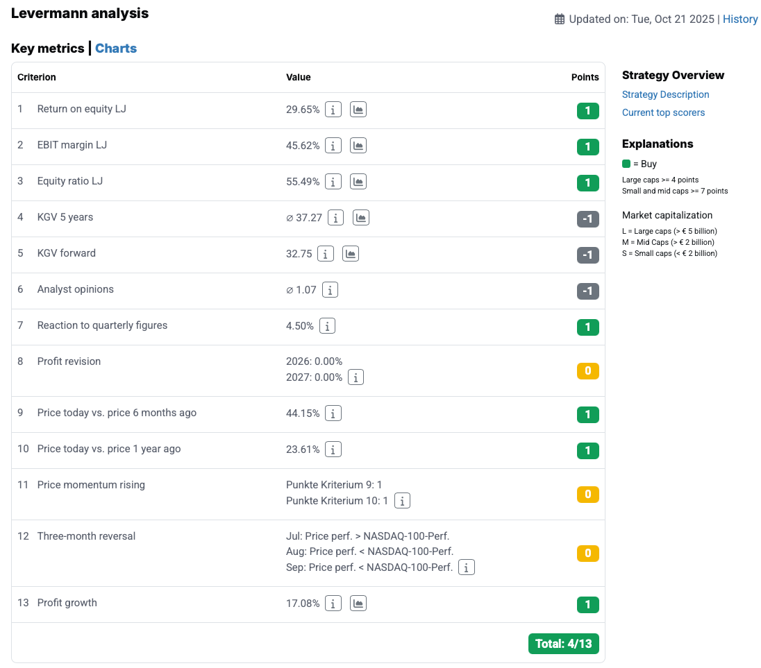 A closer look at the Levermann criteria reveals particular strengths. For example, the analysis shows that Microsoft is an extremely solid company with very strong fundamentals. It impresses with high profitability, a healthy balance sheet, and stable earnings growth. The stock price performance in recent months also points to sustained positive market sentiment.