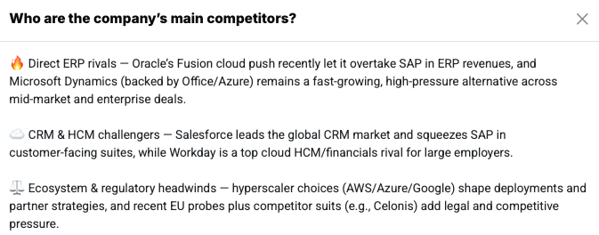 One key competitor is Oracle. Similar to SAP, Oracle offers comprehensive ERP, database, and cloud solutions. The US company has traditionally been very strong in the database sector and is investing heavily in cloud infrastructures. Another important competitor is Microsoft with its Dynamics platform and Azure cloud infrastructure. Microsoft scores particularly well thanks to the close integration of its enterprise software with the well-known Office products and a strong cloud base. Salesforce also plays a significant role, particularly in the area of customer relationship management (CRM). Salesforce is a pure cloud provider and was a pioneer of the subscription-based software model. In certain segments, SAP also competes with specialized providers that focus on individual functional areas such as human resources management, financial software, or supply chain optimization.