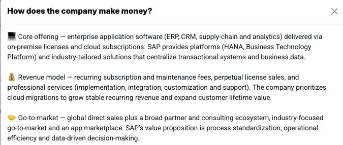 SAP is a German software company based in Walldorf, Germany, founded in 1972. The company's core business is developing business management software that companies can use to control their central business processes. These include, for example, accounting, controlling, human resources, purchasing, production, logistics, and sales. SAP supports companies in digitizing their processes, managing data centrally, and making data-based decisions in real time. SAP also has a very strong international position. With a market capitalization of almost €200 billion, the company is one of the largest software manufacturers in the world and the market leader in enterprise software. Hundreds of thousands of companies worldwide use SAP solutions, including many large corporations, but also medium-sized businesses and public institutions.