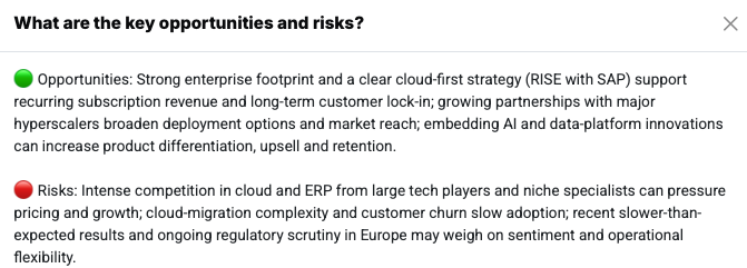 This presents SAP with significant opportunities. The ongoing global digitalization trend is increasing demand for integrated software solutions. The cloud business in particular offers growth potential, as many companies want and need to modernize their systems. Recurring cloud revenues ensure predictable income and more stable business models. In addition, SAP can create additional value for customers and set itself apart from the competition through innovations in areas such as data analysis and artificial intelligence. There are also long-term expansion opportunities in emerging markets, as many companies there still need to build or modernize their IT structures.