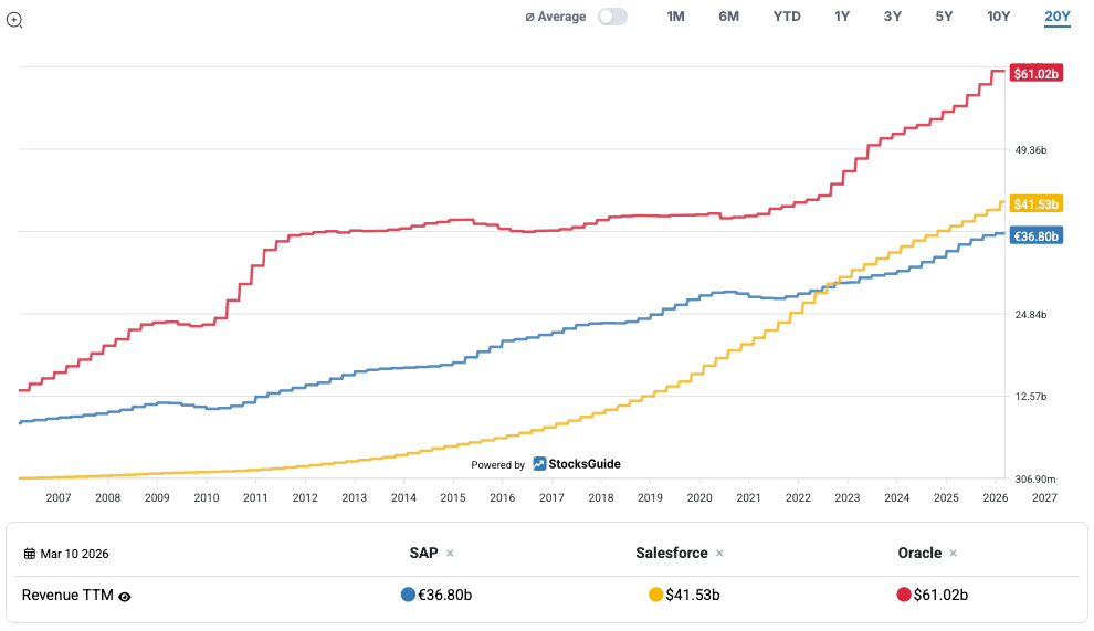 One special feature of this competition is that large customers often make very long-term decisions. Once an ERP system has been implemented, customers usually remain loyal to that provider for many years. Companies therefore compete fiercely for new implementations, migrations to the cloud, and enhancements to existing systems. Key success factors here are technological innovation, integration capabilities, and global service capacities. At the same time, cloud computing and artificial intelligence are also creating new competitive dynamics. Cloud providers can deliver new features faster and offer more flexible pricing models. In addition, platform strategies are gaining in importance, with ecosystems of partners, developers, and add-on applications being built around core software. For SAP, competition means high pressure to innovate and continuous investment on the one hand. On the other hand, its large installed customer base offers a strategic advantage. Companies that succeed in migrating their customers to modern cloud solutions while tapping into new markets can secure their market position in the long term. The revenue performance of the “Big 3” shows that SAP has fallen behind somewhat in recent years, even though its revenues have risen steadily. Little has changed in this regard in the last quarter.