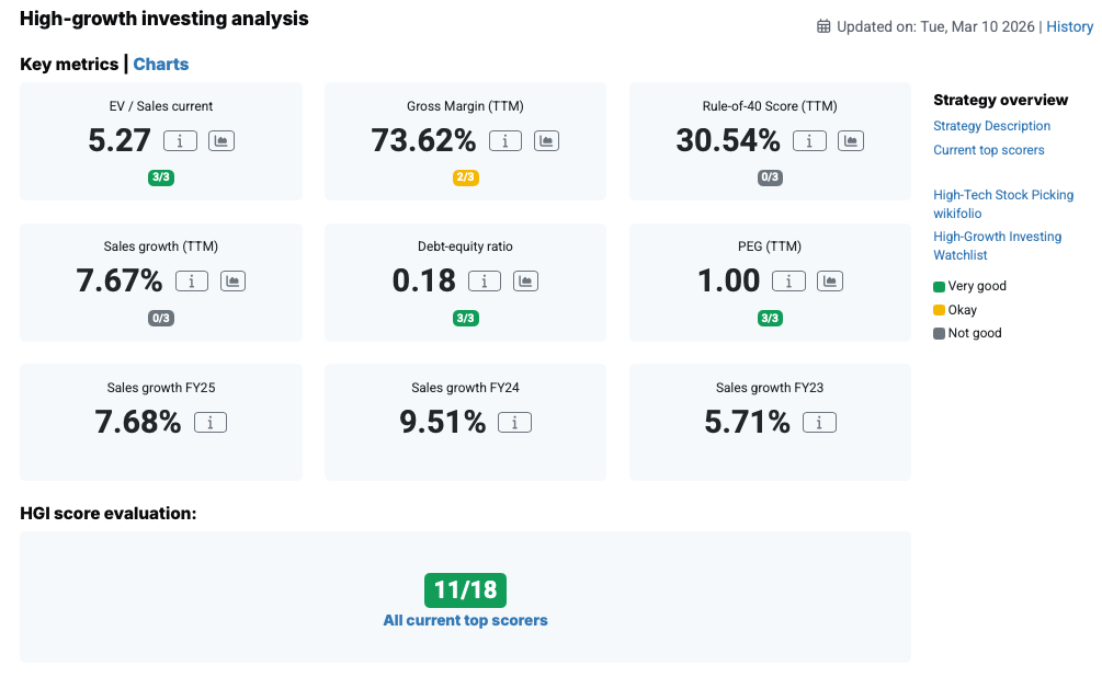 The High-Growth Investing analysis rates SAP as a solid, growth-oriented company with a stable financial base. In the HGI analysis, SAP shares are rated 10 out of a possible 18 points and have regularly been considered top scorers. The low level of debt and favorable valuation are particularly convincing. The PEG ratio of around one signals that SAP could be attractively valued in relation to its growth and earnings potential. The same applies to the EV/sales ratio of just over 5.