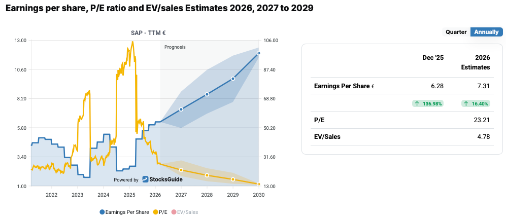 SAP is already attractively valued today, provided growth remains sustainable. In the long term, the P/E ratio could fall to 13 by 2030. Those who find the stock interesting but still want to build in a risk buffer can set up an alert in StocksGuide. I consider a P/E ratio below 20 to be an interesting indicator for re-evaluating the stock.
