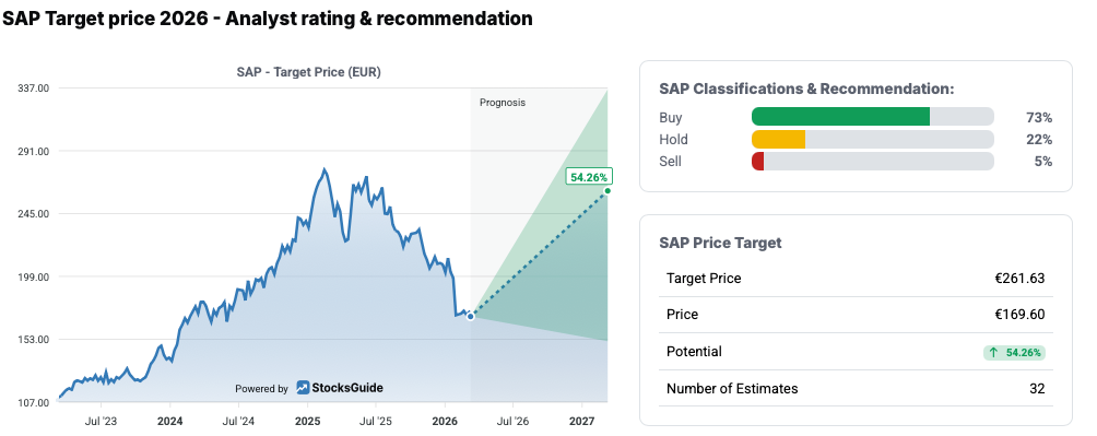 Analysts share a similar view. The vast majority are optimistic about SAP. Around 73 percent recommend buying the stock, while 22 percent advise holding, and only 5 percent see a sell signal. The average price target is €261.63, with the current price at €173.74. This implies a potential upside of over 51 percent. These assessments are based on the expectation that SAP will further expand its cloud business, increase profitability, and that the long-term growth trends of digitalization and automation will boost revenue.