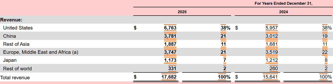 At 38 percent, the focus is clearly on the U.S. This is followed by EMEA (Europe, the Middle East, and Africa) and China, each accounting for 21 percent, and the rest of Asia (excluding Japan) at 11 percent. Japan alone accounts for 7 percent, and all other countries combined account for 2 percent.