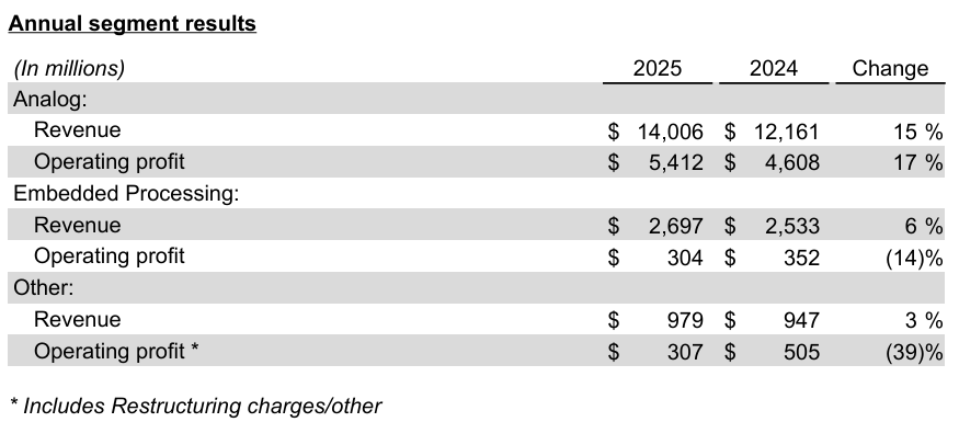 Texas Instruments' revenue is derived from its Analog, Embedded, and Other divisions. In 2025, total revenue amounted to $17.68 billion. Analog semiconductors dominate the mix, accounting for approximately 80 percent. This segment also posted revenue growth of 15 percent, reaching $14 billion.