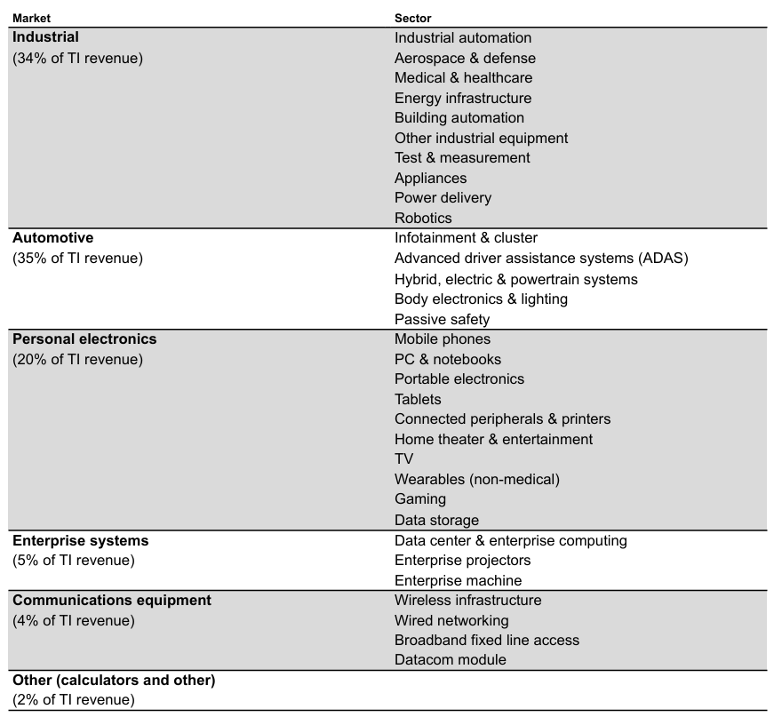 The product portfolio is thus broadly diversified, and Texas Instruments is not particularly dependent on any single sector.