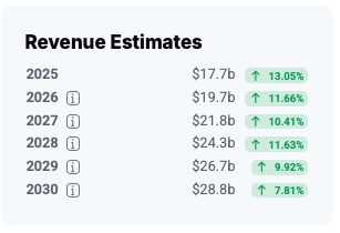 Analysts are optimistic about Texas Instruments for the coming years. Double-digit revenue growth is expected for 2026 through 2028.