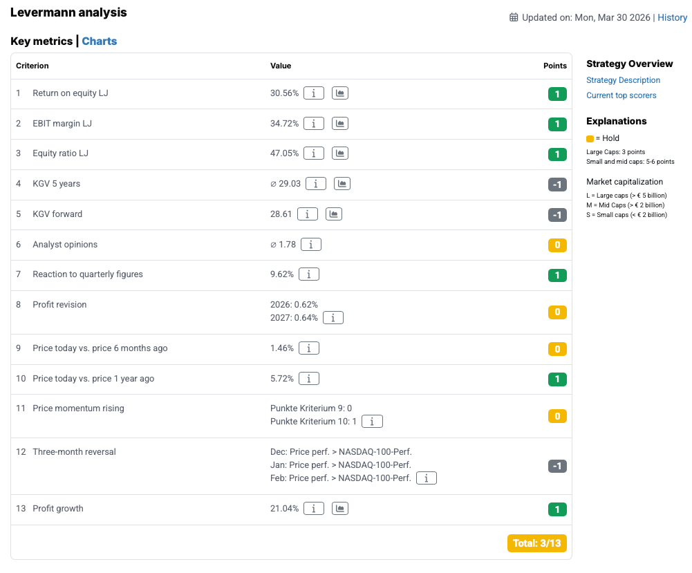 Texas Instruments recently made it into the top scorers according to the Levermann strategy. It achieved the minimum required 4 points exactly. Meanwhile, the score has dropped to just 3 points, as the stock’s performance over the last 6 months has not generated any additional points.