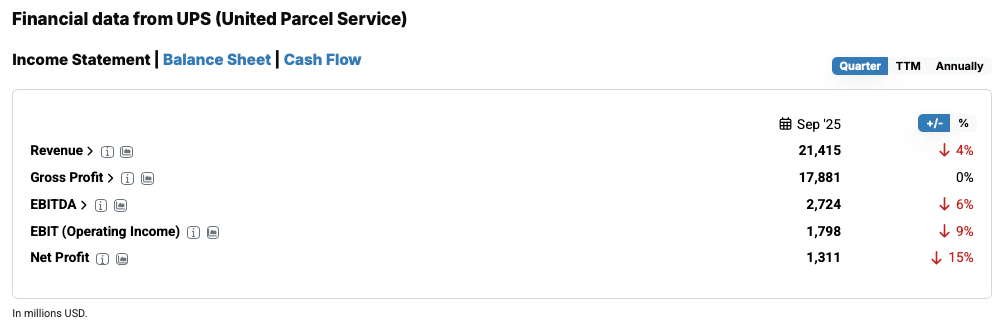 The latest quarterly report for the third quarter of 2025 shows that UPS remains in a phase of strategic restructuring but remains stable in operational terms. Overall, the business performed solidly with good profitability and a clear focus on efficiency and long-term value creation. Specifically, however, revenue declined by 4 percent in the third quarter of 2025, with net income falling by as much as 15 percent. Compared to previous quarters, this represents a negative trend. Weak economic conditions and the negative effects of Trump's tariff policy weighed particularly heavily on the results.