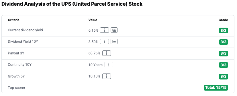 The dividend analysis shows that UPS is extremely attractively positioned from the perspective of income investors. The maximum score was achieved overall. There are reasons for this.