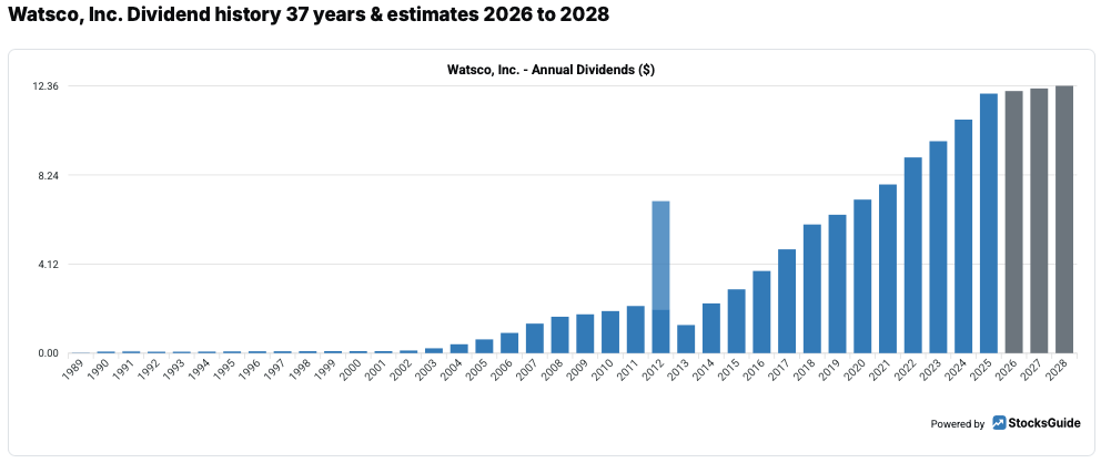 Watsco shareholders have enjoyed increasing dividend payments for many years. The dividend was only reduced in 2013 and has increased annually since then.
