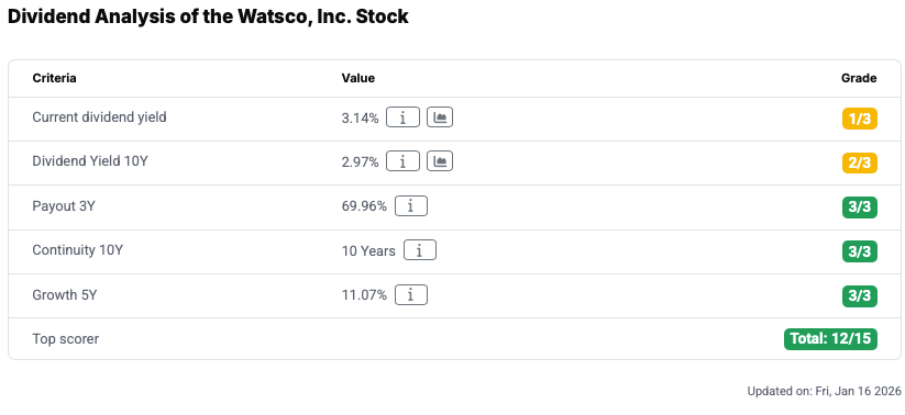 Watsco stock is currently ranked as the top scorer with 12 points according to the dividend strategy. The minimum score of 12 points required to be among the top scorers is broken down as follows.